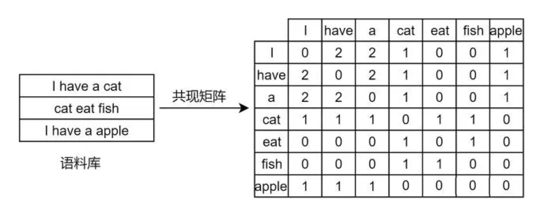 通过统计一个事先指定大小的窗口内的单词共同出现的次数,此时将词划分为两种,中心词和其他词。假设现在语料库中只有三个句子 “I have a cat”、“cat eat fish”、“I have a apple”,则可以构造出单词间的共现矩阵 A。例如 “I” 和 “have” 在两个句子中共同出现过,因此在 A中的权重为 2;而 “I” 和 “cat“ 只在一个句子中共现, A 中权重为 1 。 矩阵 A 的每一行就代表了一个单词的词向量,与 one-hot 编码类似,使用共现矩阵的词向量的维度也非常大。也可以使用 SVD (奇异值分解) 对 A进行分解,从而得到更低维度的词向量,但是 SVD 算法的时间复杂度较高,对 n×n 的矩阵进行 SVD 分解的复杂度为
