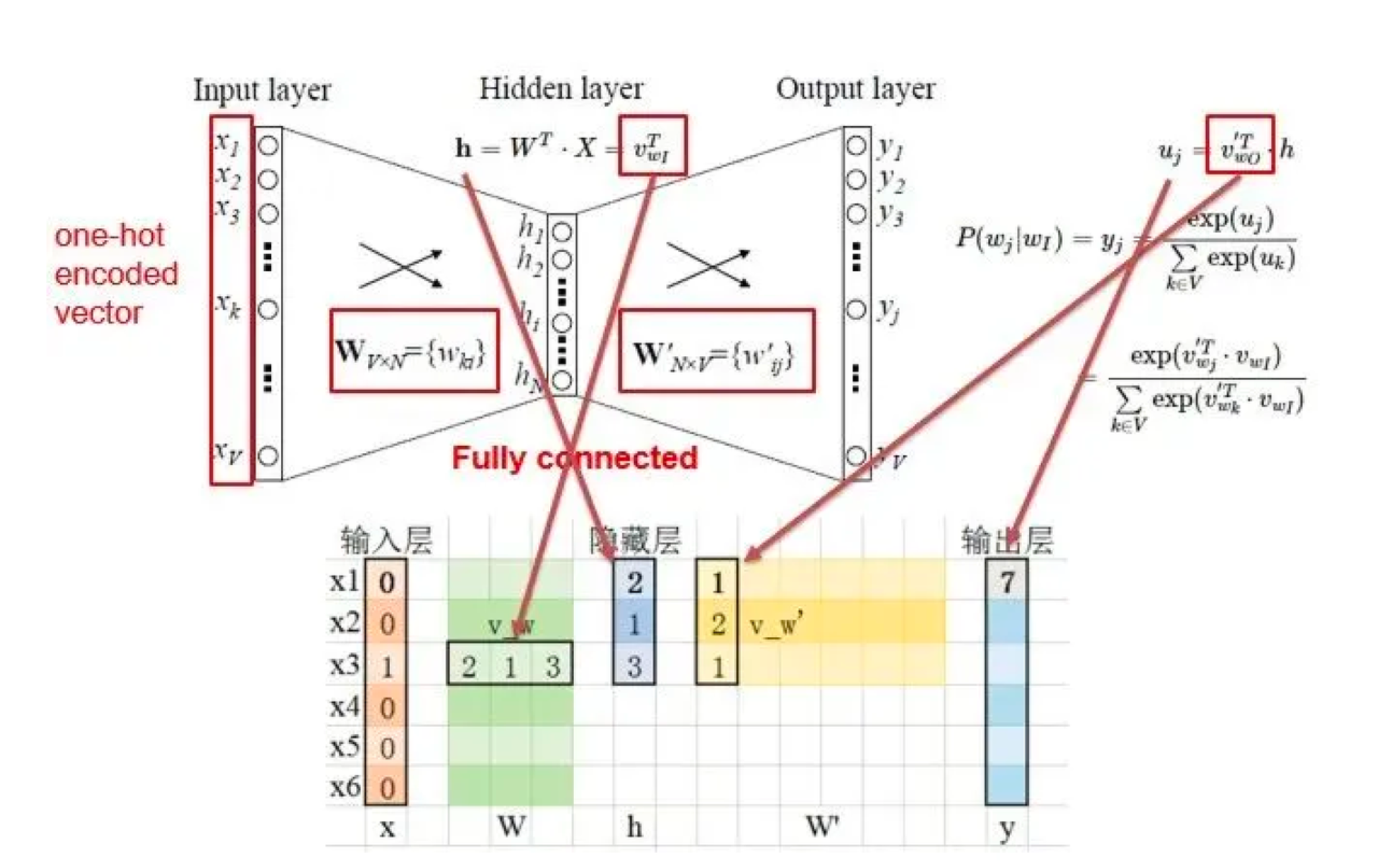 ; 输入层到隐藏层之间有一个权重矩阵W,隐藏层得到的值是由输入X乘上权重矩阵得到的(细心的人会发现,0-1向量乘上一个矩阵,就相当于选择了权重矩阵的某一行,如图:输入的向量X是[0,0,1,0,0,0],W的转置乘上X就相当于从矩阵中选择第3行[2,1,3]作为隐藏层的值); 隐藏层到输出层也有一个权重矩阵W’,因此,输出层向量y的每一个值,其实就是隐藏层的向量点乘权重向量W’的每一列,比如输出层的第一个数7,就是向量[2,1,3]和列向量[1,2,1]点乘之后的结果; 最终的输出需要经过softmax函数,将输出向量中的每一个元素归一化到0-1之间的概率,概率最大的,就是预测的词。