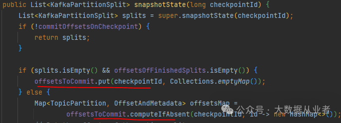 从相关源码来看,每次checkpoint触发时调用snapshotState方法会使用offsetsToCommit存储当前批次checkpoint期间已经完成读取Kafka的分区及对应offsets。