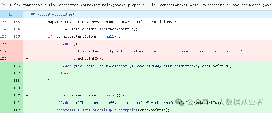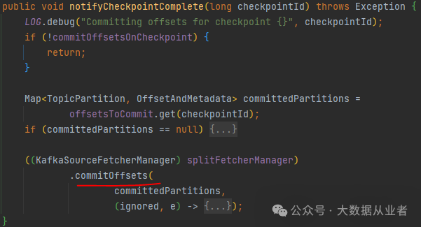 然后,在每次checkpoint成功时调用notifyCheckpointComplete方法、commitOffsets方法将offsets信息提交到Kafka。同时会清理上述offsetsToCommit中小于当前checkpointID的记录。
