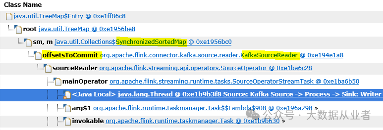 上述dump文件分析发现,即使源端Kafka没有业务数据,Flink作业KafkaSourceReader类中的SynchronizedSortedMap仍然存在大量数据,详见如下:
