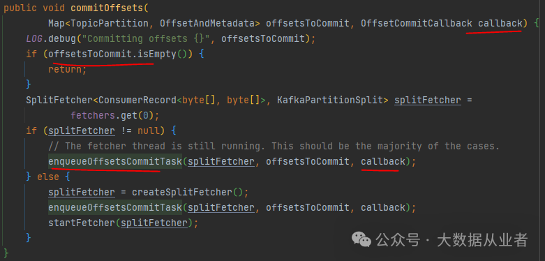 深入看下commitOffsets方法内容:enqueueOffsetsCommitTask方法就是实现提交offsets到Kafka,而callback就是实现清理上述offsetsToCommit(注意并不是下图中的offsetsToCommit)。关键问题是:下图中的入参committedPartitions(也就是下图中的offsetsToCommit)如果为空,则不会触发提交offset,这个没毛病。但是也不会触发清理上述offsetsToCommit,这个就有毛病了。