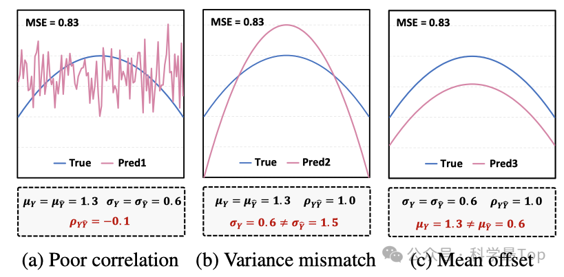 为了说明 MSE 的局限性,我们来看图 1 中三个具有相似 MSE 值但预测质量不同的预测结果。图 1a 中的预测与真实值的相关性较差,未能捕捉到整体的方向和模式。相比之下,图 1b 中的预测虽然与真实值的总体形状相符,但未能匹配其变异性,方差失配导致波动动态失真。另一方面,图 1c 中的预测保持了形状,但存在均值偏移,致使整体预测水平出现持续偏差。这些例子表明,相关性、方差和均值反映了结构相似性的不同但又相互补充的方面,能够更全面地评估预测与真实值之间的一致性。