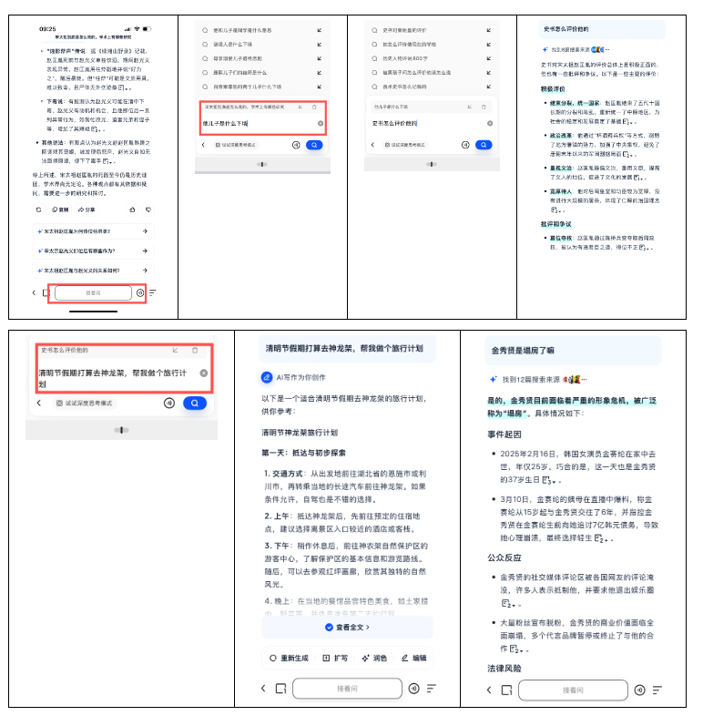 接着,让夸克安排清明节假期行程、又「接着问」金秀贤最近塌房的八卦,问得很跳跃、但它每次都能精准接招。