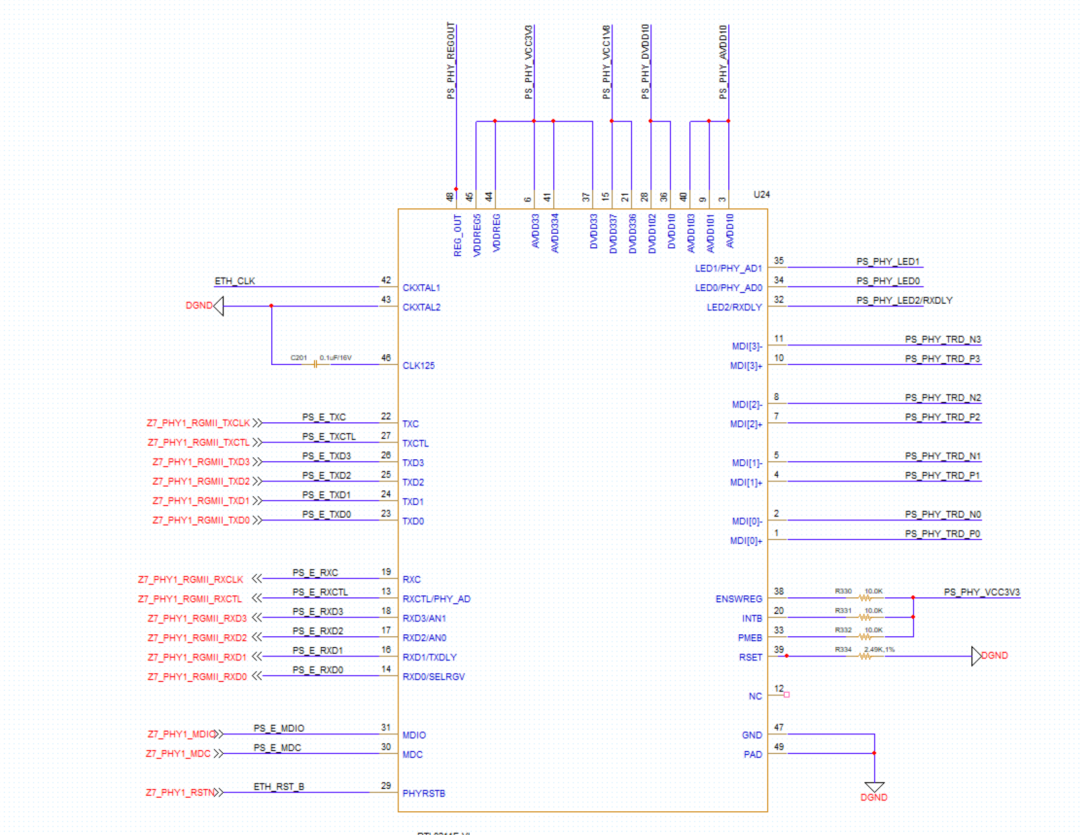 以太网 PHY 芯片是连接到 ZYNQ 的 PS 端 BANK501 的 GPIO 接口上。RTL8211E-VL 芯片支持 10/100/1000 Mbps 网络传输速率,通过 RGMII 接口跟 Zynq7000 PS 系统的 MAC 层进行数据通信。RTL8211E-VL 支持MDI/MDX 自适应,各种速度自适应,Master/Slave 自适应,支持 MDIO 总线进行 PHY 的寄存器管理。