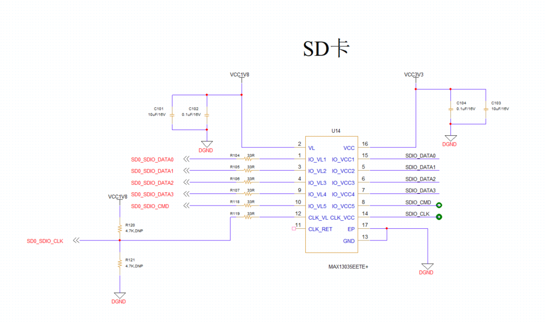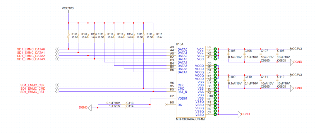EMMC 连接到了 ZYNQ 的 PS 端接口,接口采用 SD 模式。EMMC 具备体积小,容量大,使用方便,速度快等优点,数据时钟可以达到 50MHZ。由于直接焊接在板上,因此可以在震动或者环境相对恶劣的场合使用。