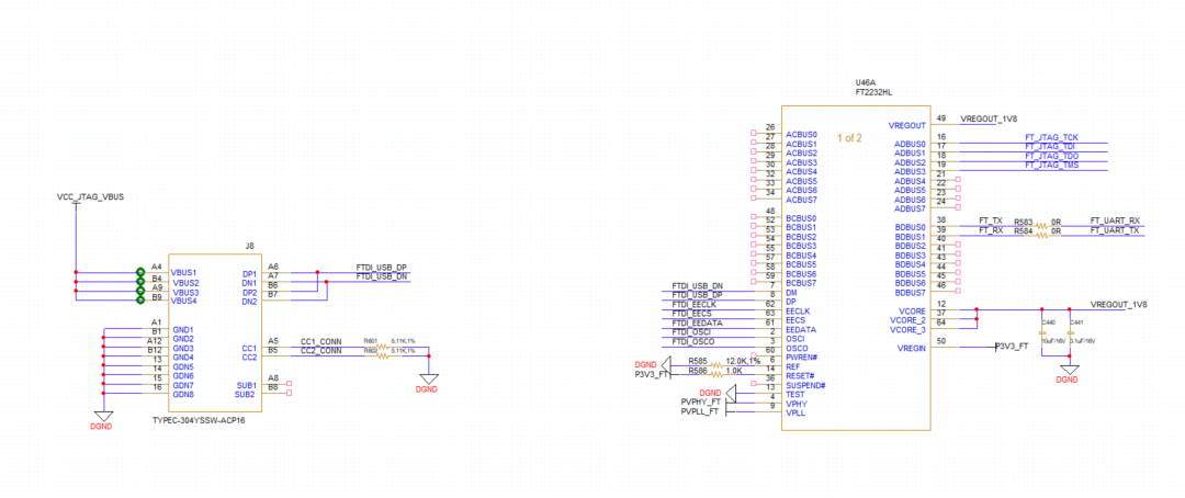 通过 FT2232H 提供JTAG和UART支持 。FT2232H是一个USB2.0高速(每秒480兆位)至UART/FIFO 芯片。 具有在多种工业标准串行或并行接口配置的能力。有两个多协议同步串行引擎(MPSSE)允许使用JTAG,I2C和SPI两个通道同时进行通信。多协议同步串行引擎 (MPSSE) 是某些 FTDI 客户端 IC 的一项功能,允许模拟多种同步串行协议,包括 SPI、I2C 和 JTAG。