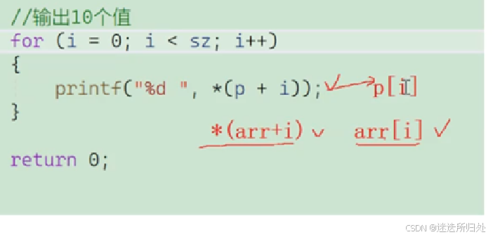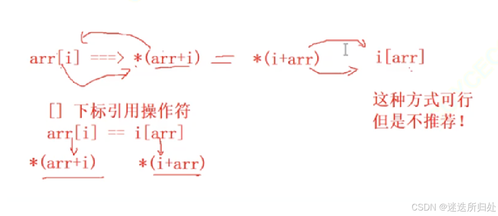 }将 *(p+i) 换成 p[i] 也是能够正常打印的,在这里解引用操作符和下标引用符产生的效果相同 同理arr[i] 应该等价于 *(arr+i),数组元素的访问在编译器处理的时候,也是转换成⾸元素的地址+偏移量求出元素的地址,然后解引⽤来访问的