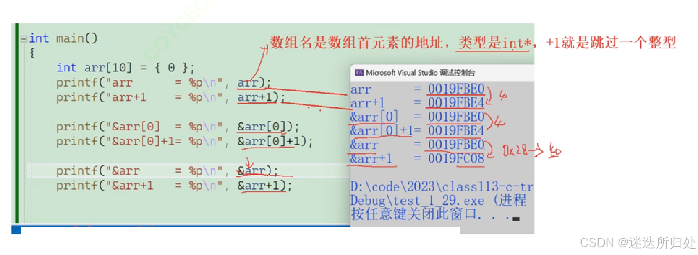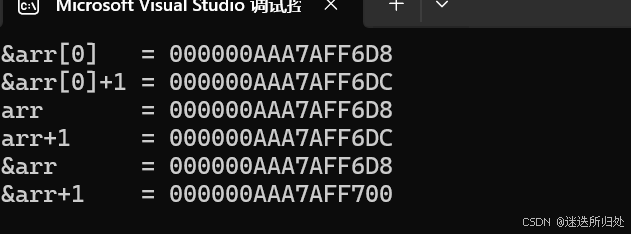 我们发现&arr[0]和&arr[0]+1相差4个字节,arr和arr+1 相差4个字节,是因为&arr[0] 和 arr 都是⾸元素的地址,+1就是跳过⼀个元素 但是&arr 和 &arr+1相差40个字节,这就是因为&arr是数组的地址,+1 操作是跳过整个数组的