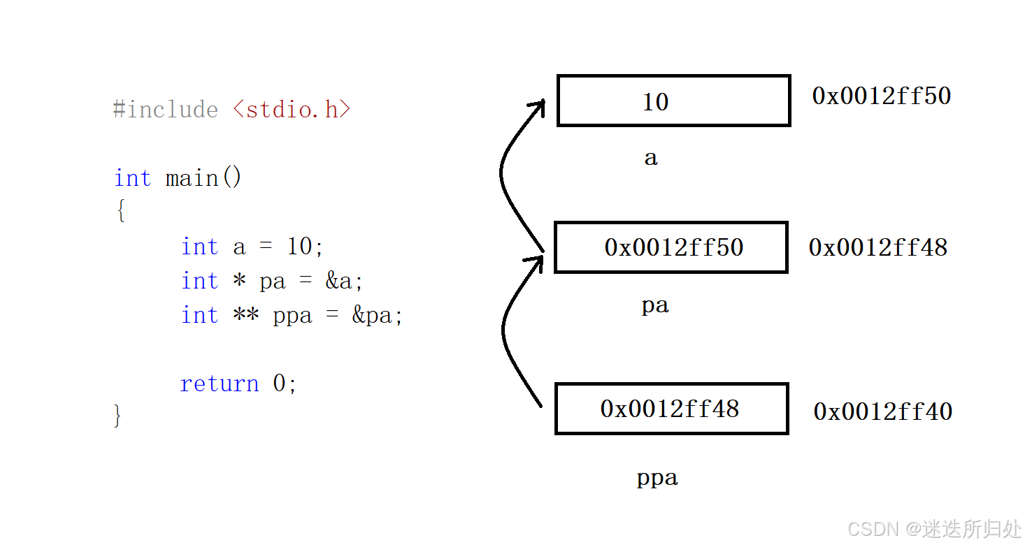 *ppa 通过对ppa中的地址进⾏解引⽤,这样找到的是 pa , *ppa 其实访问的就是 pa