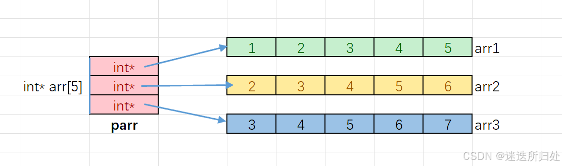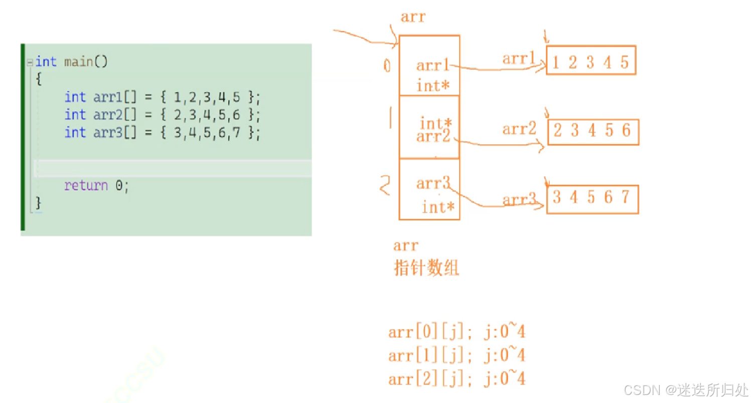 parr[i]是访问parr数组的元素,parr[i]找到的数组元素指向了整型⼀维数组,parr[i][ j]就是整型⼀维数组中的元素