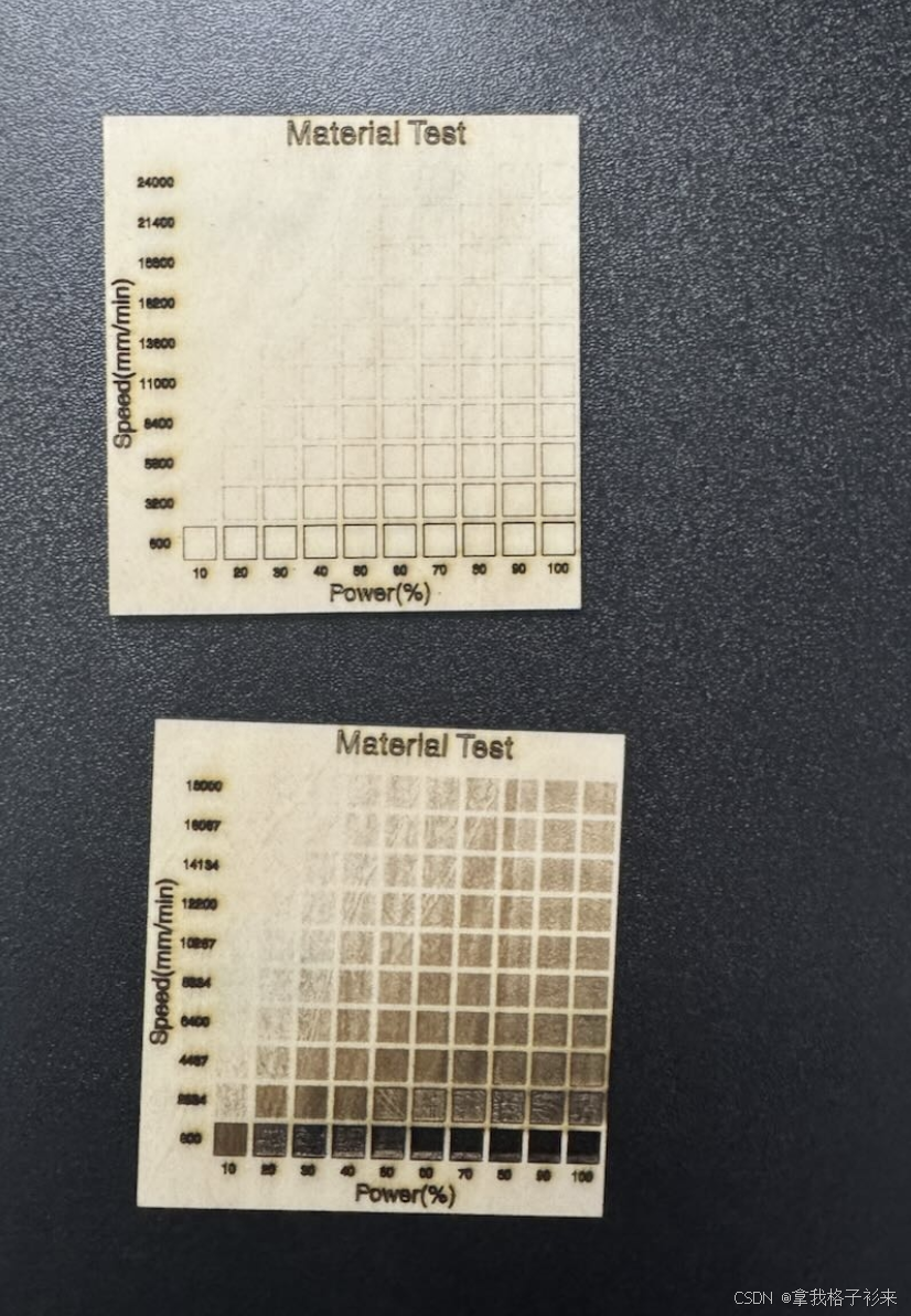 材料测试矩阵在测试激光头在某一种材料上的表现,很有必要,如果你在一种新的材料上进行加工时,最好先做一次材料测试矩阵,挑选出合适的功率和速度。