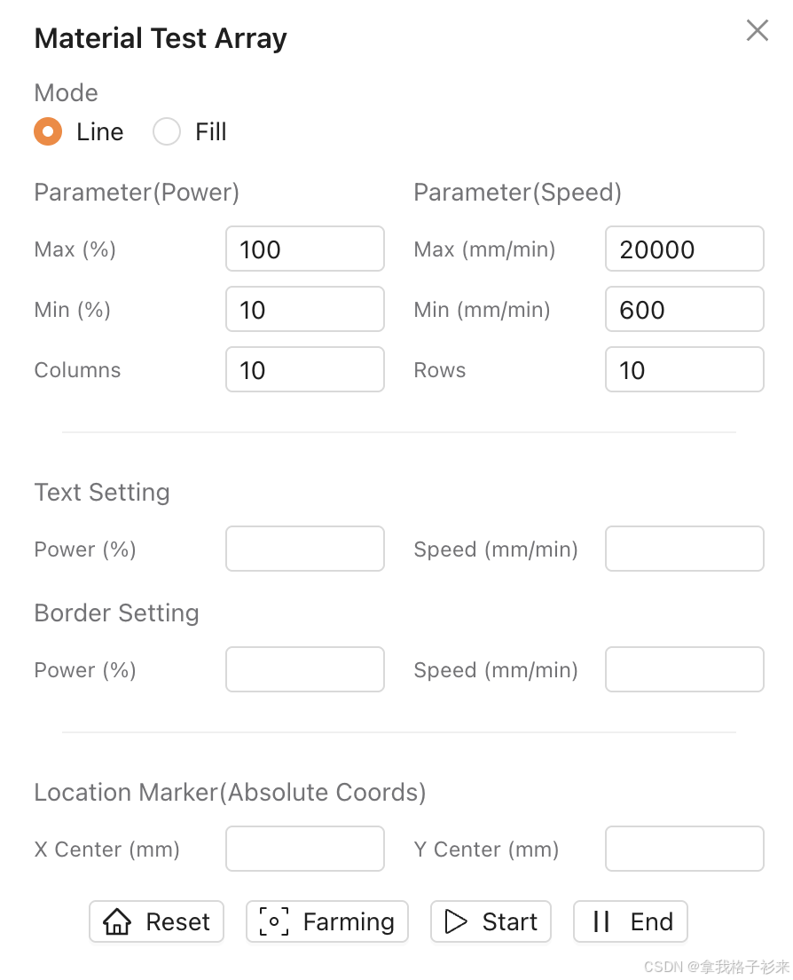 整个表单需要设置,雕刻模式还是切割模式,然后设置最小最大速度,最小最大功率。 以及字体的功率和速度,还有切割木板的功率和速度。以及左上角的顶点坐标。