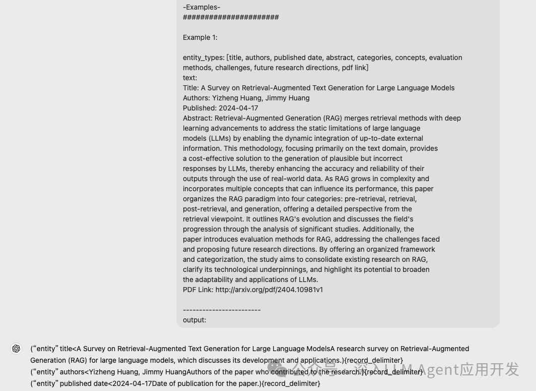 根据GPT生成的实体,我们修改entity_extraction.txt中任务说明部分、Example中的entity_types和Real Data部分的entity_types。既然需要提取的实体类别已经更新,接下来就是更新few shot的Example输出了。拷贝Prompt开头到Example的output,然后粘贴至ChatGPT中,他会根据Prompt中的指令继续扩写后续的output。