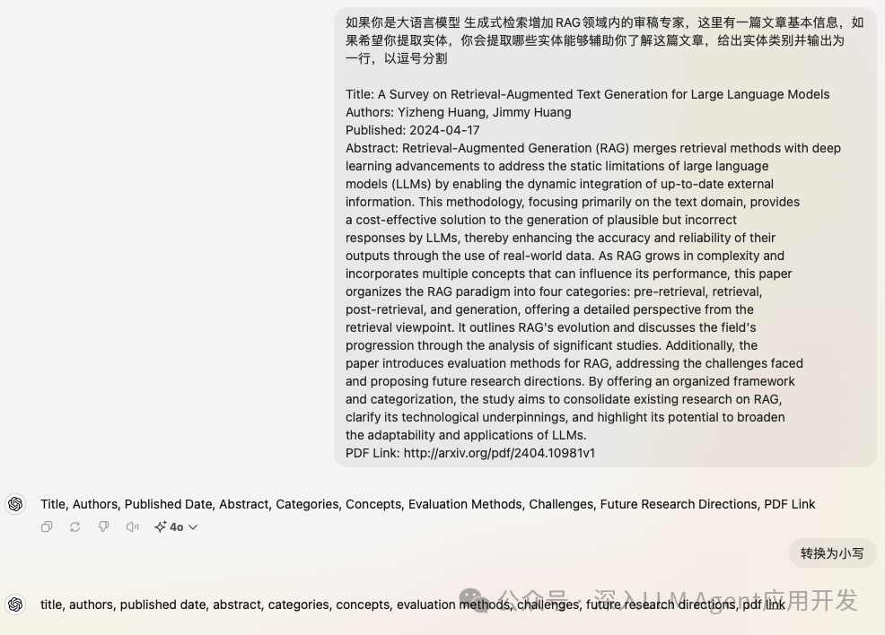 只是这个任务输出要求非常高,要求输出的格式还是有点小复杂的,这也是为何很多小模型可能在实体提取阶段就失败的原因之一。所以如何手调呢?首先你需要知道你的输入文章都有哪些实体,对于论文我们咨询一下ChatGPT看看。