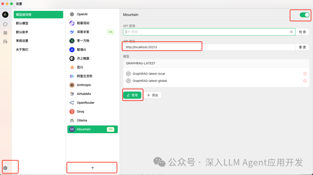 点击Cherry-Studio左下角的设置,点击中间的加号,设置api base为http://localhost:20213,然后点击管理加载模型列表。我将所有索引输出的目录分别配置为global和local,这样方便选择不同的索引目录。