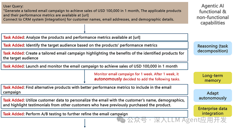 然后,它监控执行情况/环境,并进行自主调整。在本例中,智能体意识到自己无法实现销售目标,于是自主增加了以下任务:(寻找替代产品)-(利用客户数据)-(进行 A/B 测试)。同样重要的是,大多数用例都需要与企业系统(如本例中的客户关系管理)集成。例如,可以参考 Anthropic 最近提出的模型上下文协议(MCP),将智能体与企业数据所在的外部系统连接起来。鉴于此类复杂任务的长期运行性质,内存管理是智能体系统的关键。初始电子邮件营销活动启动后,智能体需要对营销活动进行为期 1 个月的监控。