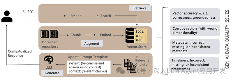 不正确:由于嵌入过程中的问题,一些向量最终可能会损坏、不完整或生成不同维度的向量。这会导致输出结果混乱或脱节。例如,如果人工智能根据不同质量的录音生成音频,结果可能会明显不均匀。在文本生成中,数据中不一致的语法或语气可能会导致内容混乱或脱节。缺失数据:缺失向量或元数据。例如,根据不完整数据集生成可视化设计的 GenAI 可能会输出特征缺失的产品。及时性:如果为 RAG 管道中的提示提供相关上下文的矢量存储中的文件已经过时,那么 GenAI 系统可能会导致不相关的输出。启用了 GenAI 的聊天机器人在回答与政策相关的问题时,如果从过时的政策文件中获取信息,就可能对问题做出不准确和误导性的回答。