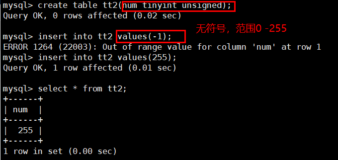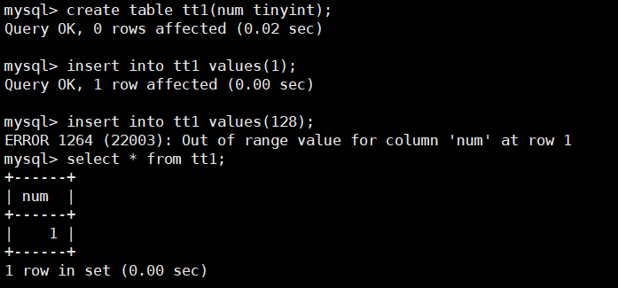 mysql> create table tt1(num tinyint);