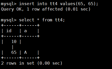 mysql> insert into tt4 values(65, 65);