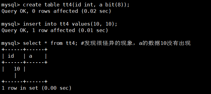 mysql> create table tt4 ( id int, a bit(8));