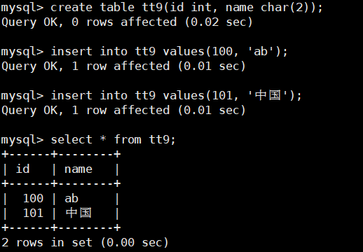 mysql> create table tt9(id int, name char(2));