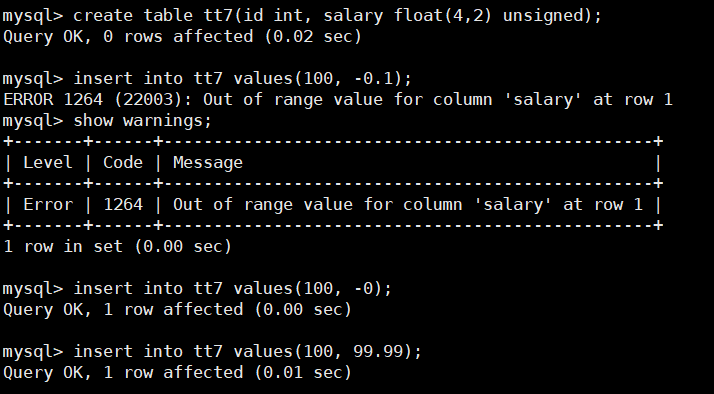 mysql> create table tt7(id int, salary float(4,2) unsigned);