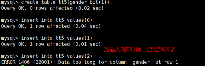 mysql> insert into tt5 values(2); -- 当插入2时,已经越界了