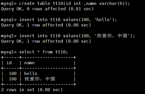 mysql> create table tt10(id int ,name varchar(6)); --表示这里可以存放6个字符