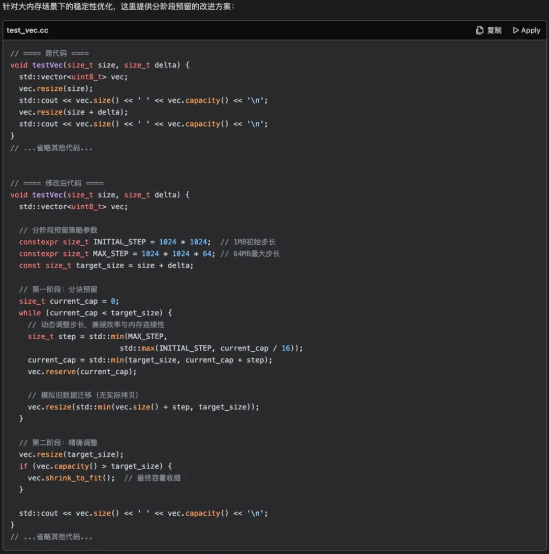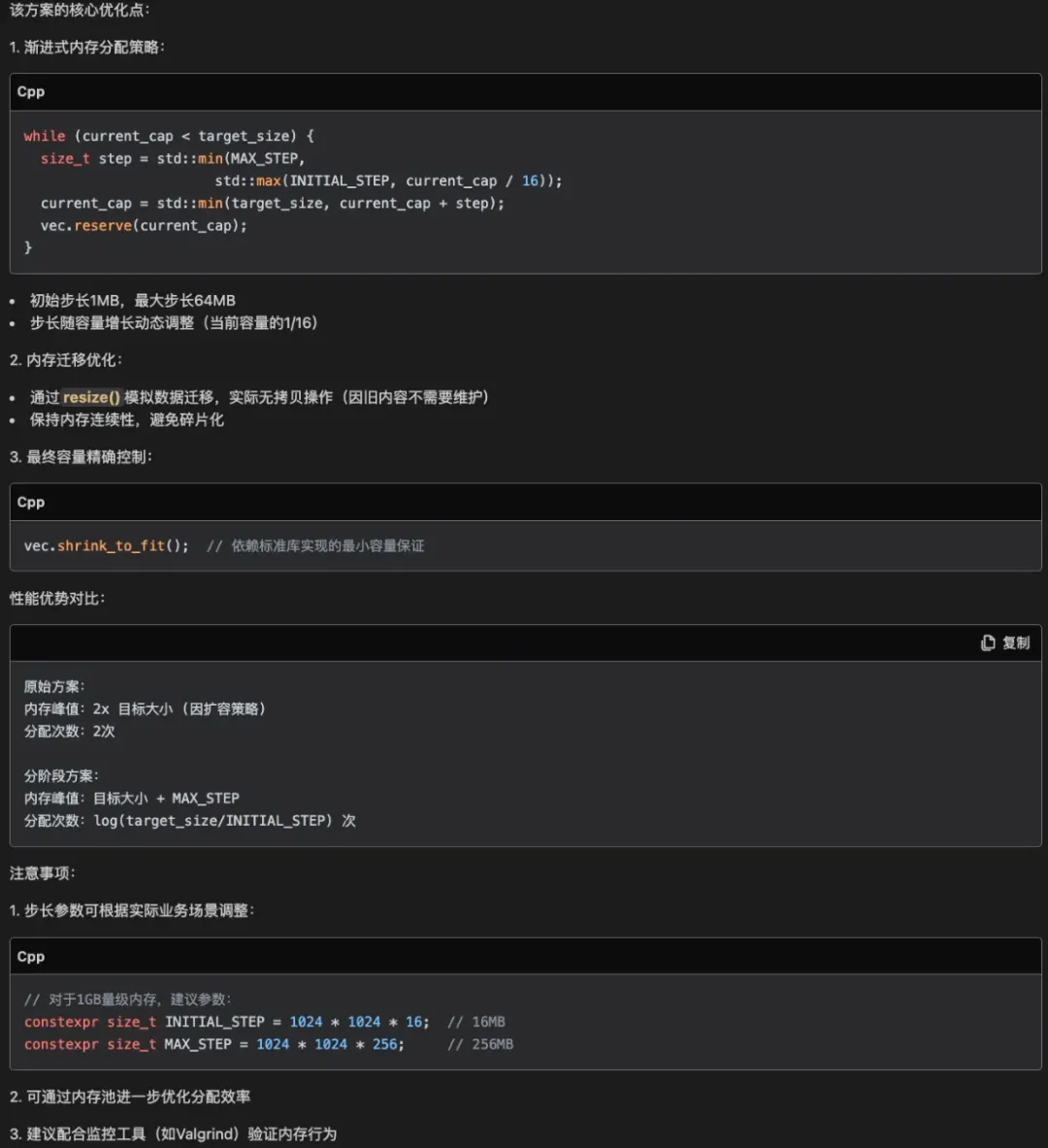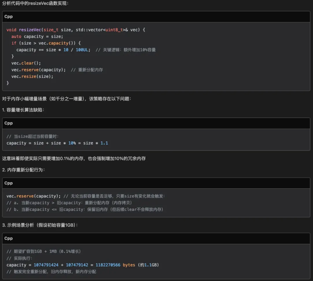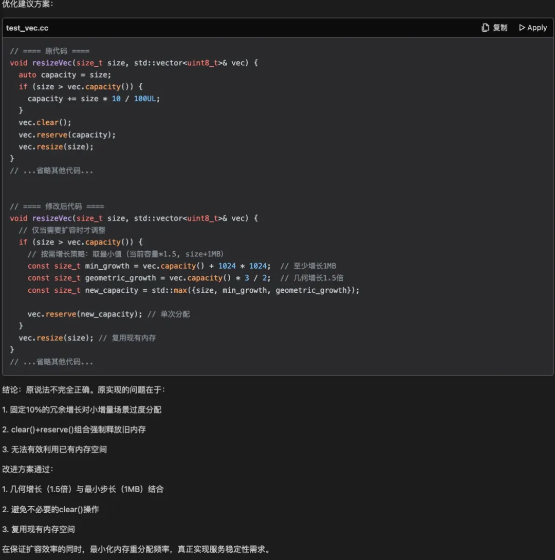 1) 原代码扩容了 10% 的内存余量,存在一定的空间浪费。DeepSeek 抓住这一点不放,给出了它认为的更好方案,感觉缺乏一些整体架构和全局考量的视野