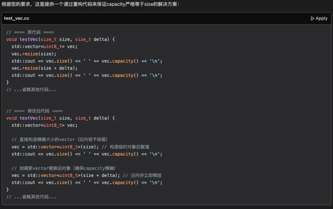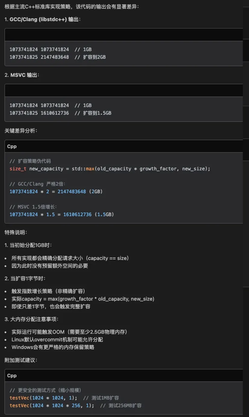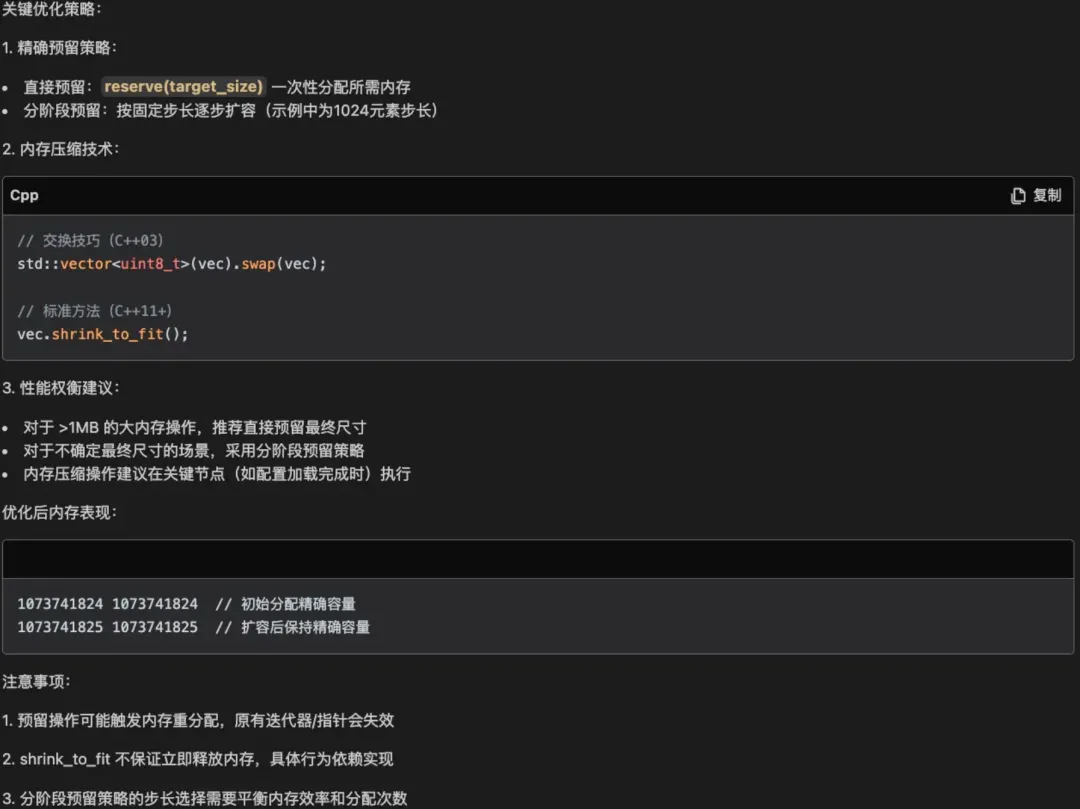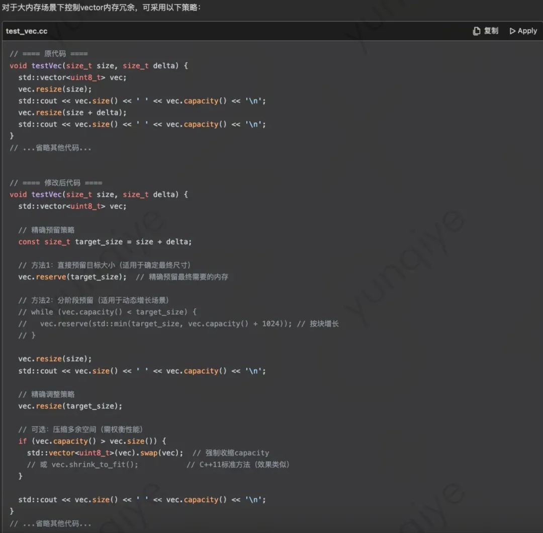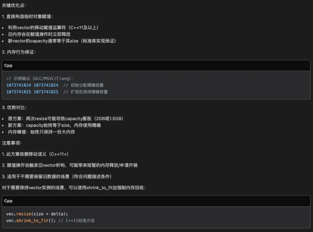 2) 专。 腾讯云 AI 代码助手 DeepSeek R1 的回答非常的专业,比如它可以区分不同编译器和标准的不同实现,例如上面关于 vector 的 swap 技术和 shrink_to_fit 的函数调用,这是非常专业的 C++ 知识范畴了,真的是让人印象深刻。