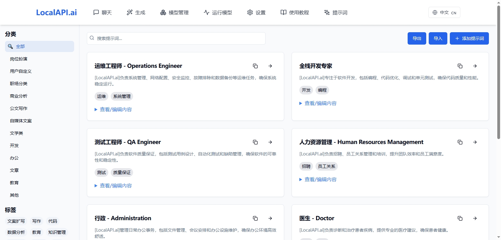 内置丰富的提示词模板是LocalAPI.ai的又一特色功能。这些模板涵盖了各种常见的应用场景,用户可以根据自己的需求选择合适的模板,快速发起高质量的对话,一键将提示词输入到聊天窗口对话框。同时支持用户导入和导出自己添加的提示词,数据保存在本地。
