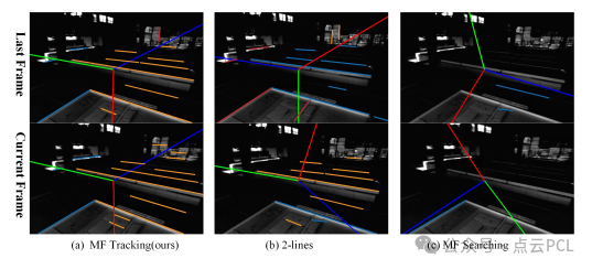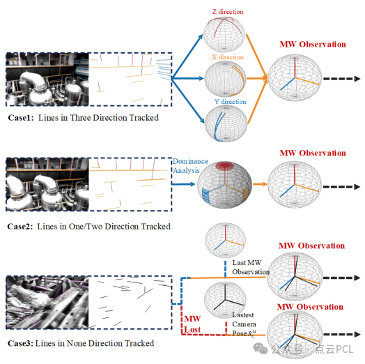 2) 跟踪:由于原始2-lines方法在特征线不足的情况下鲁棒性较差,因此本文提出了基于检测的跟踪模块,用于在连续帧中跟踪MF。该模块利用前一帧的结构线信息来估计当前帧中的MF。MF的三个主要轴方向可以看作消失点的空间位置。该算法通过不同的跟踪情形来分类,包括以下几种类型: