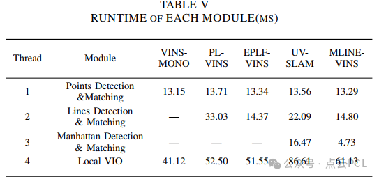 对每个模块的计算性能进行了逐帧评估,如表 V 所示。我们的算法和 EPLF-VINS 在线特征检测和匹配中表现出色,主要得益于实现的线追踪算法。此外提出的基于检测的 MFs 估计模块比 UV-SLAM 中采用的 2-lines 方法更具计算效率。尽管加入了额外的线特征和曼哈顿约束,但局部 VIO 并未显著增加计算负担。虽然我们的方法运行时间略高于 VINS-MONO,但对于实时应用而言,仍然是可以接受的。