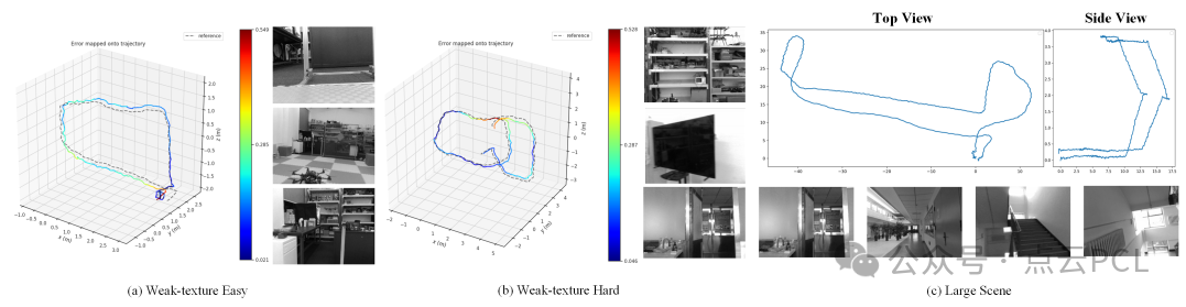 1. 小型室内场景:首先,我们在一个小型室内实验室环境中评估了所提出的方法。如图 14 所示,数据在两种不同的条件下收集:慢速旋转(称为“弱纹理容易”)和快速旋转(称为“弱纹理困难”)。我们使用运动捕捉设备获得地面真值数据,并使用 RMSE 来评估性能。