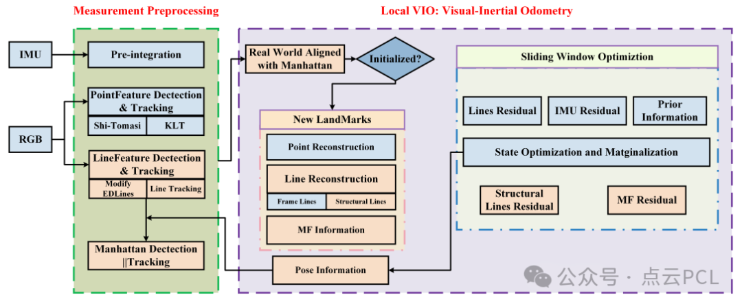 本文提出的MLINE-VINS一种专为复杂室内环境设计的鲁棒单目视觉惯性里程计(VIO)系统。系统的处理流程如图 2 所示。提出了创新性的曼哈顿结构与线特征跟踪策略,并结合曼哈顿约束进行后端优化。该方法旨在提升 VIO 系统在复杂室内环境中的鲁棒性和精度。