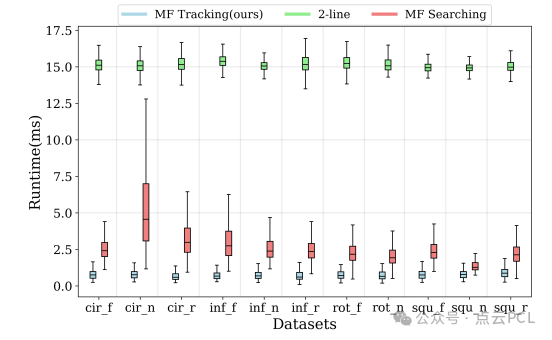 图12. 在KAIST-VIO数据集中使用MF追踪、2线法和MF搜索法的MF估计运行时间。