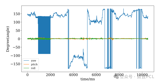 由于曼哈顿世界坐标系(MW)和VIO世界坐标系(VIO world frame)不在同一个坐标系中,我们需要研究它们之间的关系。在类似MH01的数据序列中,使用连续的十帧进行初始化以获得VIO世界坐标系。为了得到曼哈顿世界坐标系(MW),将相机坐标系中的曼哈顿框架(MF)转换到IMU坐标系中。VIO世界坐标系和曼哈顿世界坐标系之间的角度误差如图7所示。由于VINS-MONO初始化过程中偏航角无法观察到,因此偏航角的值不稳定。翻滚角和俯仰角的差异很小,表明MW和VIO世界坐标系的z轴方向平行。此外,在室内环境中,建筑物的铅直线通常与重力方向平行,因此MW的z轴方向对应于重力方向。经过VIO初始化后,机体坐标系表示为RWbi,而在相机坐标系中,MW表示为RMci。两者之间的关系可以用矩阵表示,从而可以将VIO世界坐标系中的姿态转换为MW。当VIO世界坐标系与MW对齐后,便于利用MW的特性重新启动跟踪,且可以通过MW来观察偏航角。