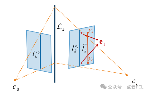 图8. 线残差模型的表示。蓝色线表示3D线在图像中的重投影,橙色线表示观测值。残差el是通过计算两条线之间的距离得出的。