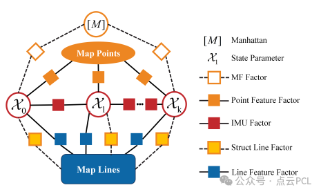 优化状态(Optimization State):系统的完整状态向量包含以下部分:多个时刻的位姿、速度、加速度和陀螺仪偏置,多个尺度因子,以及多个线特征的正交表示。所有状态均在曼哈顿世界坐标系(MW)中进行估计。