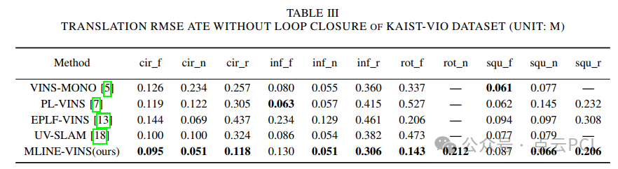 2. 挑战环境中的漂移评估:为了评估我们方法的漂移,我们使用 KAIST-VIO 数据集比较了不同方法的累计误差。如图 11 所示,展示了每种方法在 cir n 序列上的跟踪轨迹和漂移误差。结果表明,结合额外的线特征显著减少了漂移,特别是在旋转期间。与仅使用点和线特征相比,结构规律性提供了一个更可靠的手段来约束平移和旋转中的漂移。通过利用新型的线特征追踪和曼哈顿约束,我们的方法实现了最小的漂移和最佳的性能。