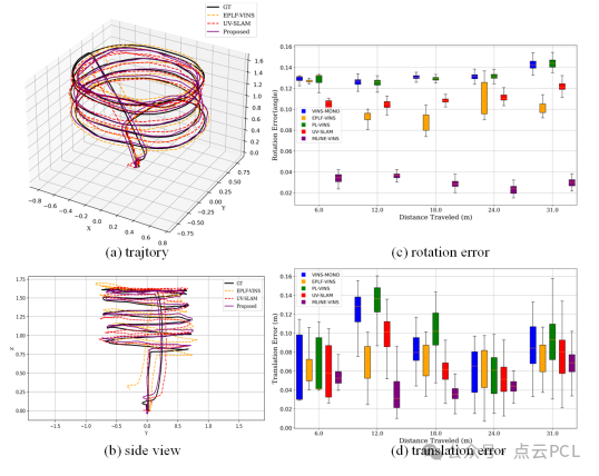 图11. KAIST-VIO测试中的轨迹和相对位姿误差。(a)和(b)显示了我们的方法、EPLF-VINS和UV-SLAM的轨迹。(c)和(d)显示了每种方法的旋转和平移的平均相对位姿误差。