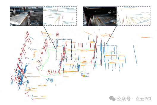 图 1. 所提出的 VIO 系统在 EuRoc MH05 数据集上的结果。蓝色、黄色和红色线分别表示沿 X、Y 和 Z 方向的 3D 结构线。绿色轨迹表示相机的历史位姿。黑色点表示 3D 点,同时,顶部还展示了从 RGB 图像中提取的 2D 结构线特征。