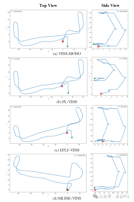 图15. 大场景测试结果。左图显示了轨迹的俯视图,而右图显示了侧视图。红色圆圈表示起始点,绿色十字标记表示终点。