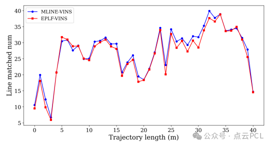 图10. EuRoC测试中MLINE-VINS与EPLF-VINS之间的平均线匹配数。蓝线表示MLINE-VINS(我们的)跟踪的线数,红线表示EPLF-VINS跟踪的线数。