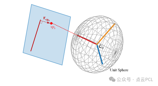 图9. 曼哈顿残差的表示。c0坐标系中的MF显示在单位球面上。红点表示其中一个消失点,图像上的红线对应于一条结构线。消失点与线之间的距离表示该方向上MF的残差