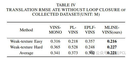 对于其他方法,实验中使用默认参数。UV-SLAM 的后端在实际场景中表现不佳,导致所有序列均失败。RMSE 结果如表 IV 所示。在 Weak-texture Easy 和 Weak-texture Hard 数据集上,MLINE-VINS 达到了最佳性能。在包含纯旋转和快速运动的 Weak-texture Hard 数据集上,传统的线匹配方法偶尔会失败。