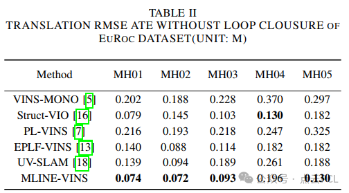 首先在基准数据集上评估我们的方法。然后使用实际录制的自定义数据集验证系统的有效性。将该方法 MLINE-VINS 与先进的单目方法进行比较,包括基于点的方法 VINS-MONO、基于线的方法 EPLF-VINS、PL-VINS,以及基于结构约束的方法 Struct-VIO 和 UV-SLAM。所有测试都使用已发布的版本和默认参数进行。所有实验均在配备 Intel Core i7-7700 3.60GHz CPU 和 24GB RAM 的 PC 上进行。为了公平比较,所有系统都关闭了回环闭合和全局捆绑调整。