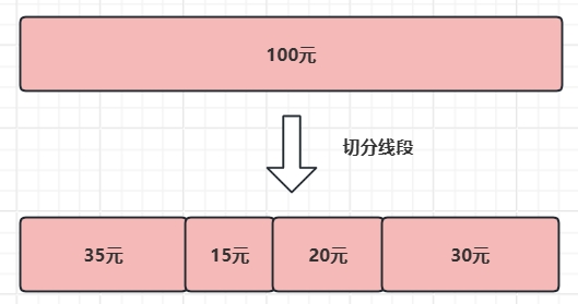 [0.24, 21.86, 15.57, 16.86, 3.45, 3.18, 5.48, 13.01, 6.76, 13.59]考虑一种新的解法,把红包总金额想象成一条很长的线段,而每个人抢到的金额就是这条主线段上的某个子线段,如下图: