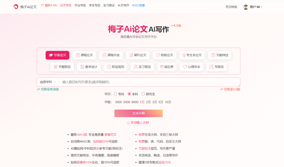写论文那可是个让人头疼的事儿,不过有了梅子 AI 论文,就轻松多了。它是个专业又高质量的智能论文 AI 生成器,支持图、表、代码这些元素,还能自定义大纲。